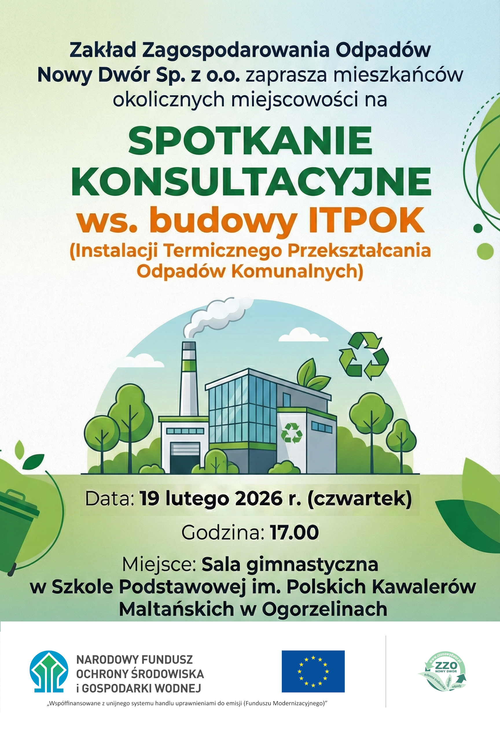 Serdecznie zapraszamy mieszkańców gminy Chojnice na spotkanie konsultacyjne ws. budowy ITPOK (Instalacji Termicznego Przekształcania Odpadów Komunalnych) w Zakładzie Zagospodarowania Odpadów Sp. z o. o. w Nowym Dworze.